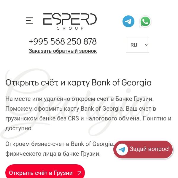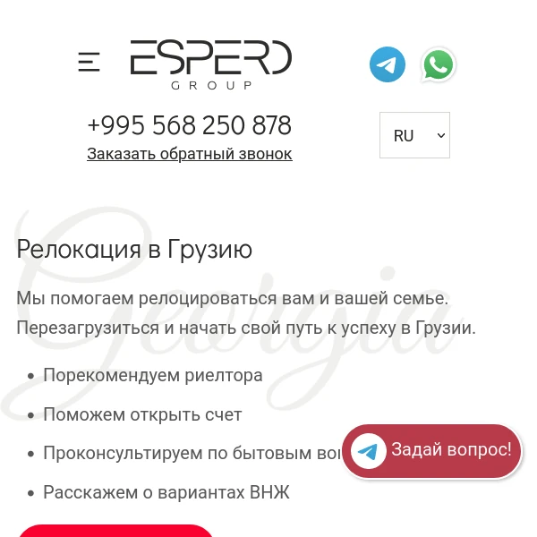 Рекомендую компанию Эсперо всем, кто планирует релокацию в Грузию. Это надежный и ответственный партнёр, который сделает все возможное для того, чтобы ваш переезд прошел гладко. Большое спасибо за вашу помощь и поддержку!